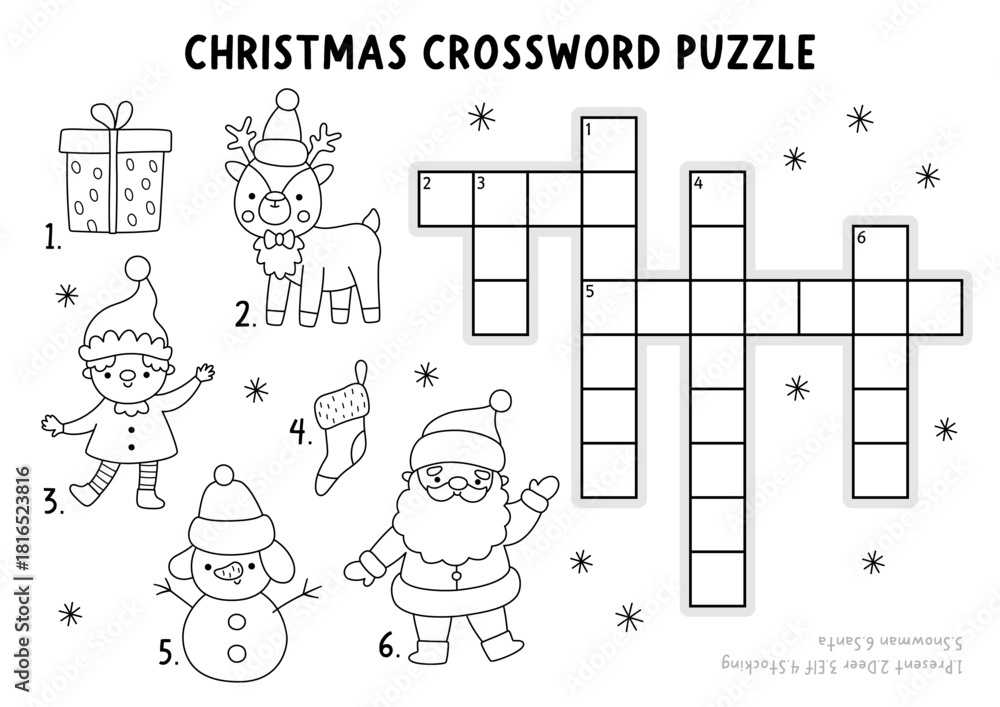 Plakat - Vector Christmas crossword puzzle for kids. Black and white New Year quiz with Santa Claus, deer, elf, present, snowman, stocking. Line winter holiday educational cross word activity, coloring page.