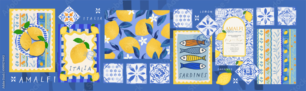 >Plakaty>Wybrane motywy - zobacz więcej !>Konie>Summer. Lemons. Amalfi. Vector illustration of sardine fish, Mediterranean seamless pattern, Italian blue ceramics and tiles, lemons for invitation, poster, background, postage stamp or card