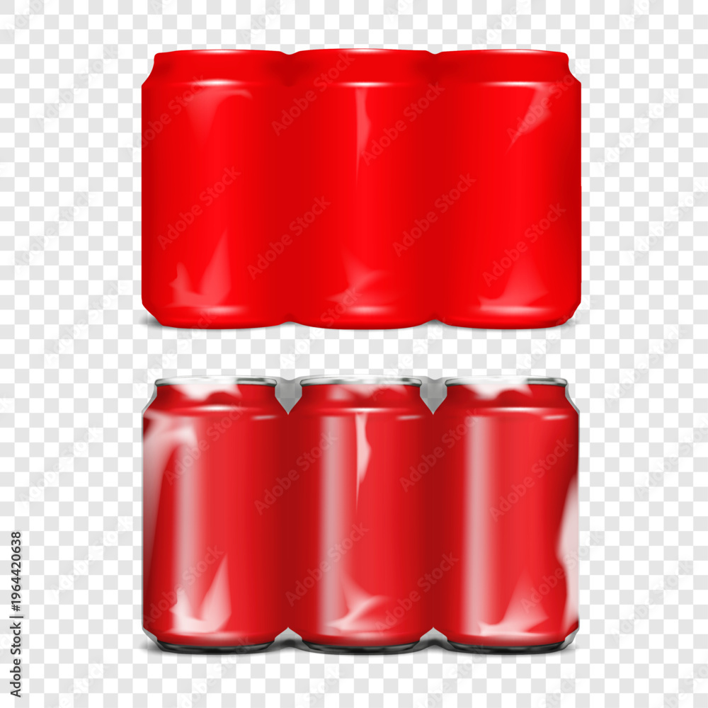 Plakat - Blank aluminum can three in row multi-pack packaging. Realistic vector mockup. Opaque and transparent shrink film wrap soda or beer package. Template. Multipack plastic sleeve drink wrapping. Mock-up.
