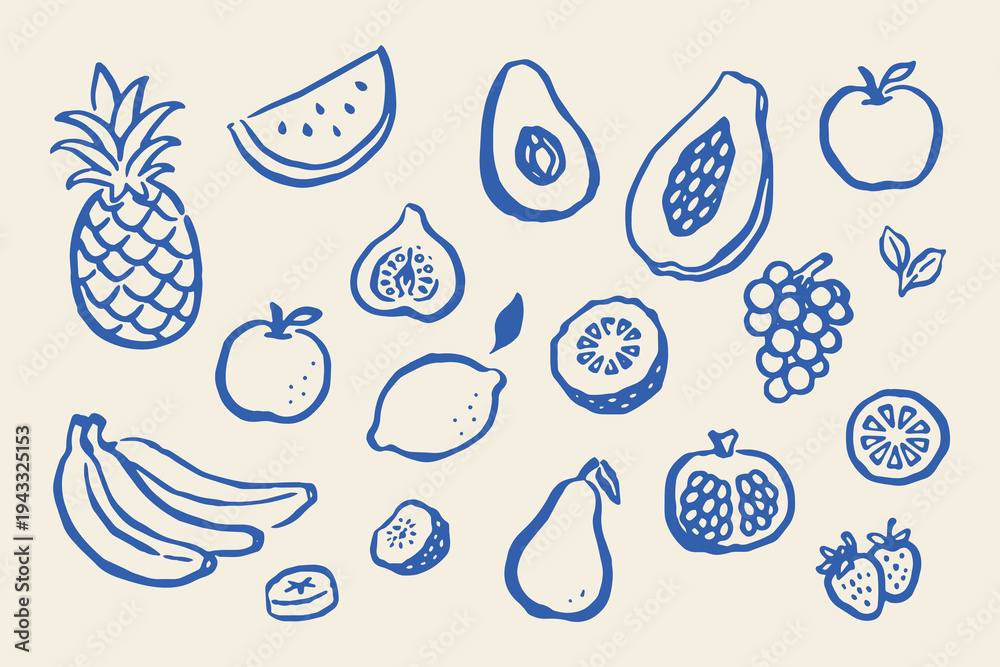 Plakat - Fruit collection naive hand drawn vector illustration.