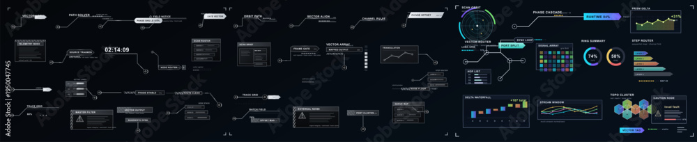 >Plakaty>Wybrane motywy - zobacz więcej !>Kosmos>Futuristic HUD interface sheet with routing diagrams, telemetry panels, scan modules, signal charts, vector nodes, and sci-fi control elements in a dark technical dashboard layout.