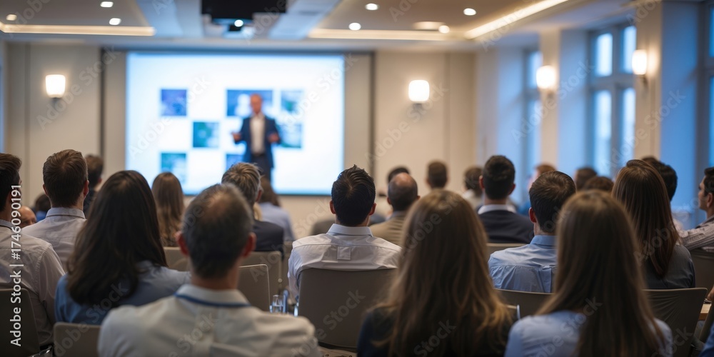 Plakat - Audience Watching a Presentation. Defocused Blurred Presenter During Conference Meeting.