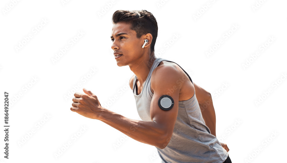 Plakat - Glucose monitor patch worn by an active person jogging outdoors illustrating the integration of health tech and fitness lifestyle in natural lighting..