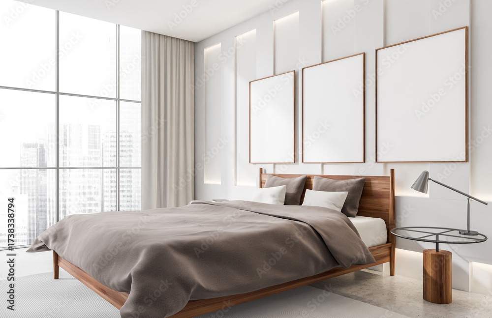 Plakat - Cozy bedroom with wooden bed, three blank posters on wall, minimalist design, bright interior with city view backdrop, concept of interior mockup. 3D Rendering.