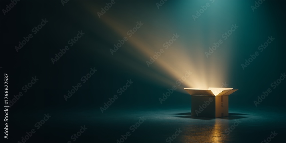 Plakat - Open cardboard box with bright light rays coming out in a darkened room, concept for opportunity discovery, innovative solutions and creative thinking.