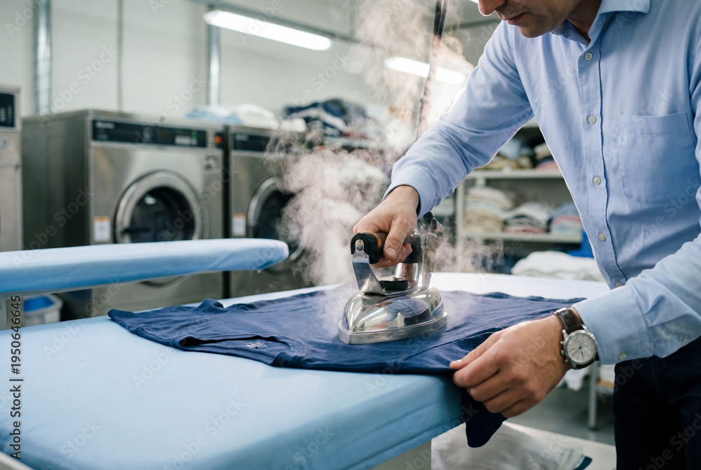 Plakat - Male laundry worker ironing blue shirt with steam in professional laundromat.
