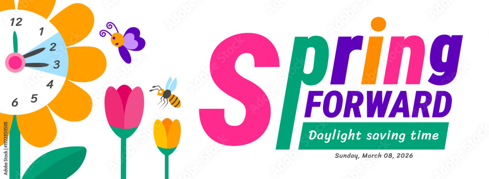 Plakat - Spring Forward 2026 Daylight Saving Time background or banner. Colorful Flower Clock Graphic with Butterfly, Bee, and Bird Elements for Sunday March 8th Seasonal Time Change Reminders and Alerts..