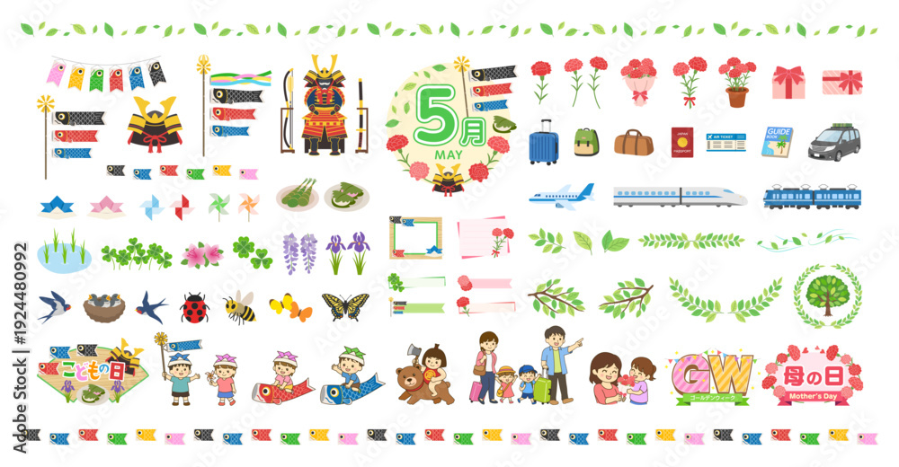 Plakat - 5月のイラストセット|こどもの日・母の日・ゴールデンウィーク・新緑・旅行素材集(ベクター).