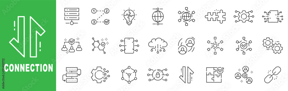 Plakat - Connection and networking outline icon set featuring cloud, data flow, integration, security, collaboration, editable stroke vector design..