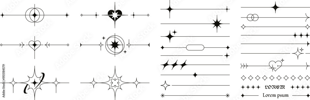 >Plakaty>Wybrane motywy - zobacz więcej !>Lew>Decorative sparkle star dividers, minimalist line borders with magical sparkles. Simple esoteric aesthetic divider with heart and twinkle star symbols, celestial border decor elements vector set
