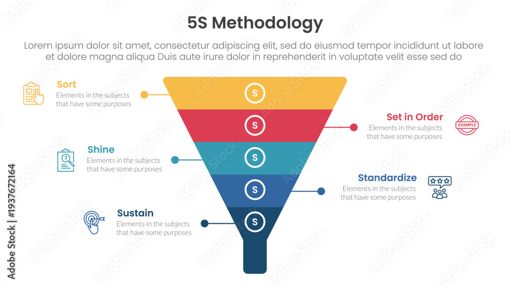 Plakat - 5S methodology infographic concept for slide presentation with funnel pyramid shape with 5 point list with flat style.