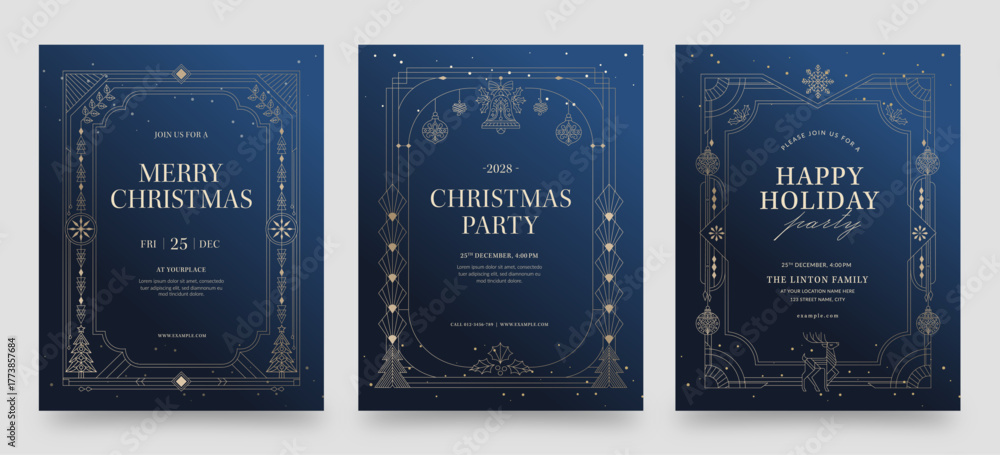 Plakat - Luxury Blue and Gold Christmas or New Year Party Flyer with Art Deco Gatsby Style Frame.