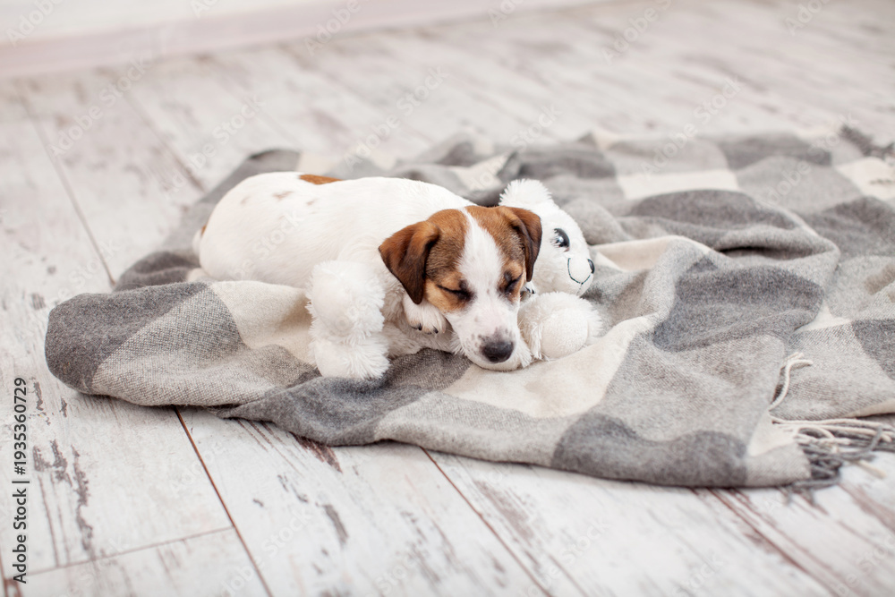 Plakat - Cute jack russell Puppy Sleeps on blanket at home and hugs toy bear, Dog sleeping at cozy living room.