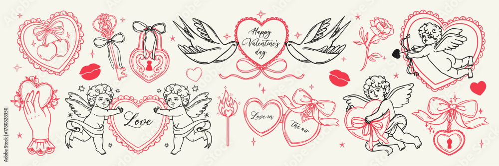Plakat - Vintage love elements. Retro Valentines day elements. Sketch elegant coquette heart, angel, cupid, flower, bird, cherry. Doodle wedding vector set.