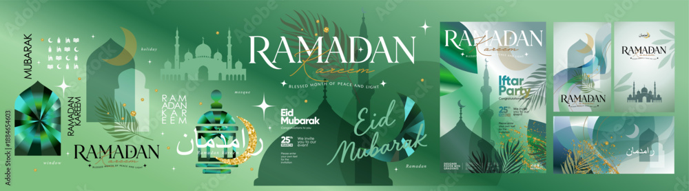 >Plakaty>Wybrane motywy - zobacz więcej !>Londyn>Ramadan Kareem and Eid Mubarak. Vector abstract modern illustrations of a mosque silhouette, window, arch, crescent moon, and lantern for icons, greeting card, iftar invitation, and poster