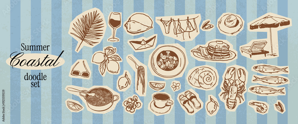 Plakat - Scrapbook summer coastal doodles. Retro mediterranean brunch food set. Crayon drawn ink picnic illustration with pasta, seafood, wine. Clip art dinner collection in vintage chalk style..