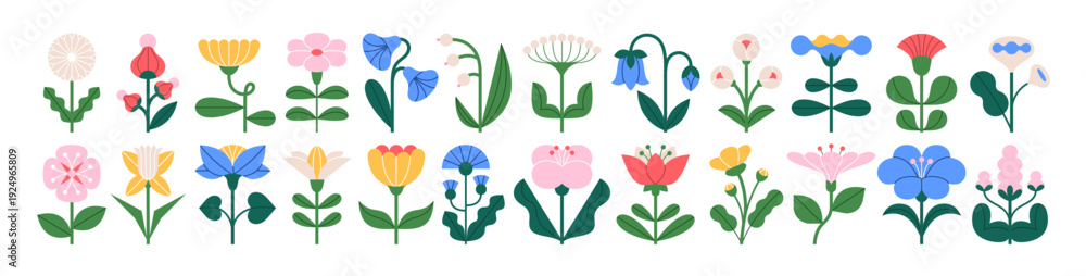 >Plakaty>Wybrane motywy - zobacz więcej !>Maki>Floral design elements, abstract folk style flowers set. Spring and summer blossoms with delicate petals, leaves. Nature decor of geometric shape. Flat vector illustration isolated on white background