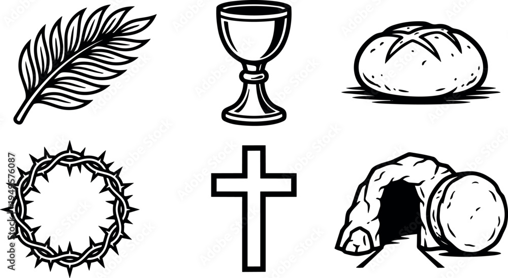 Plakat - Black and white line art of palm leaf chalice bread cross crown of thorns and empty tomb religious symbols collection.