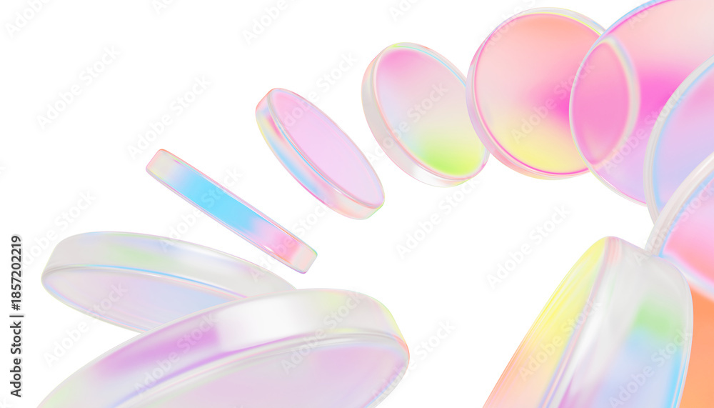 Plakat - Holographic 3d glass circle discs with iridescent gradient. Abstract geometric background with speed circular effect of rainbow color round disks, transparent plastic or acryl plates.