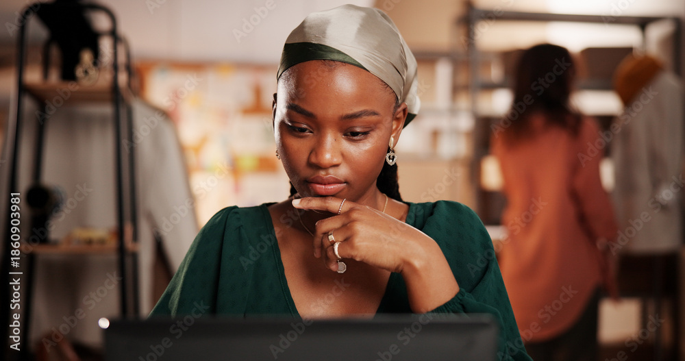 Plakat - Supply chain, startup and woman on laptop for planning, inventory and delivery checklist. Office, fashion business and person on computer for research, ecommerce and shipping for customer order.