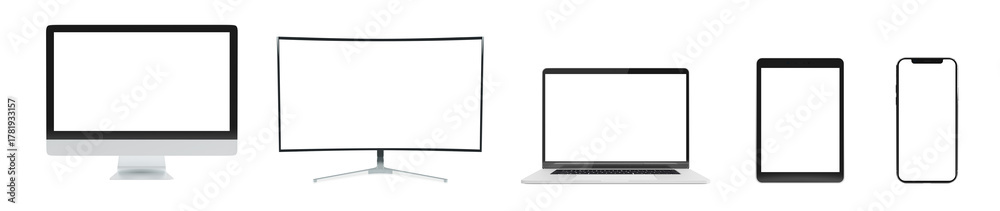 Plakat - Modern devices screens isolated on transparent background. Smartphone, tablet, laptop and computer mockup. Front view. 3d rendering.