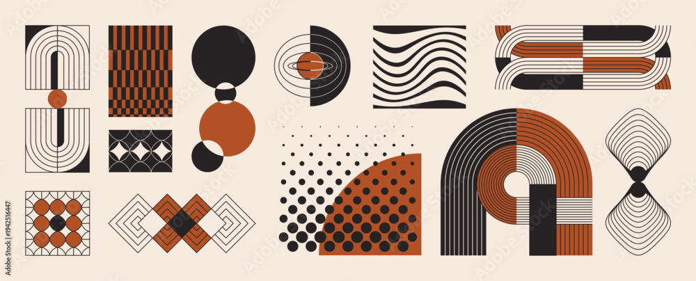 >Plakaty>Wybrane motywy - zobacz więcej !>Materiał tekstura>Mid century abstract vector element set. Retro aesthetic contemporary stripe line art, geometric shape in monochrome. Art form design for wall art, decoration and wallpaper.