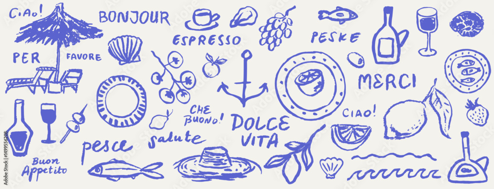 Plakat - Italian style vacation hand drawn vector illustrations in grunge chalk or charcoal rough doodle sketch style. Summer vacation elements for poster, placard or menu prints and decoration with lettering..