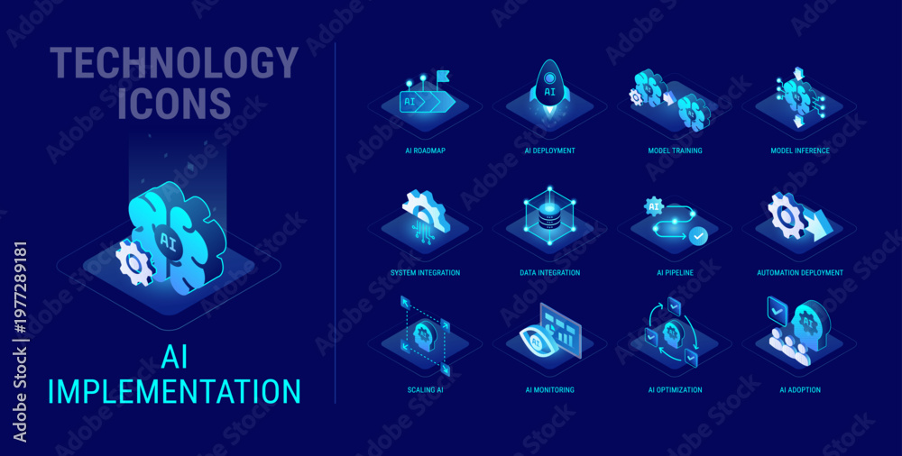 Plakat - Technology icons set for AI Implementation workflow diagram - AI deployment, integration, roadmap, AI model training, inference, pipeline, scaling - high quality isometric vector.