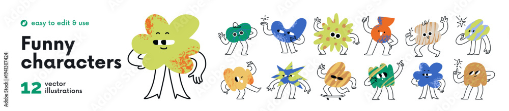 Plakat - Cute doodle blobs, funky figures with emotions, expressions set. Abstract cartoon shapes characters with happy smiling faces. Funny comic emoji. Flat vector illustration isolated on white background.
