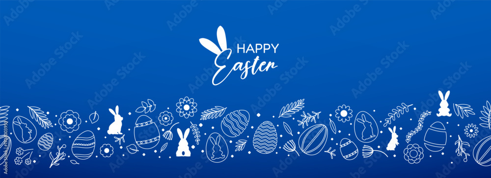 Plakat - Happy easter banner with hand drawn icons. White outline elements on blue background. Festive spring greeting composition.