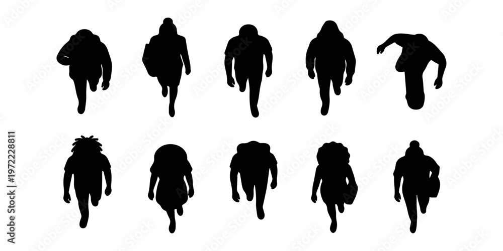 Plakat - Top View Walking People Silhouette Set, Overhead Crowd Black Figures Collection, Urban Pedestrians Entourage for Architecture Plans and City Scene Design.