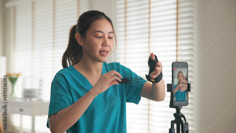 >Plakaty>Wybrane motywy - zobacz więcej !>Muzyka>Young adult woman asia people anti aging expert modern nurse live talk video call selfie camera mobile phone app mental health care Online digital virtual asian vlogger filming hand wrist pain physio.