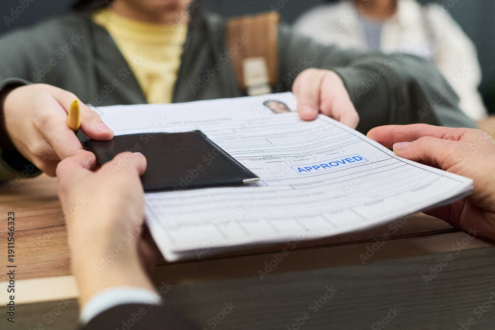 Plakat - Girl handing passport and approved visa application form to unknown woman across counter at visa center, background showing blurred people waiting.