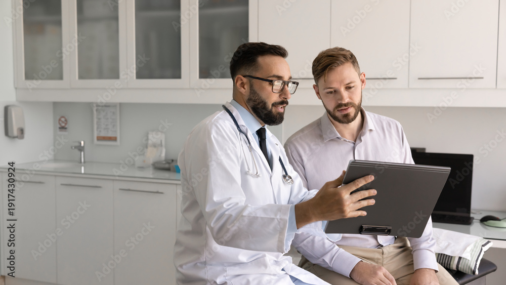 Plakat - Discussing health report. Male doctor sit on couch with young patient visiting clinic show medical document on clipboard explain therapy schedule present diet plan review checkup results. Copy space.