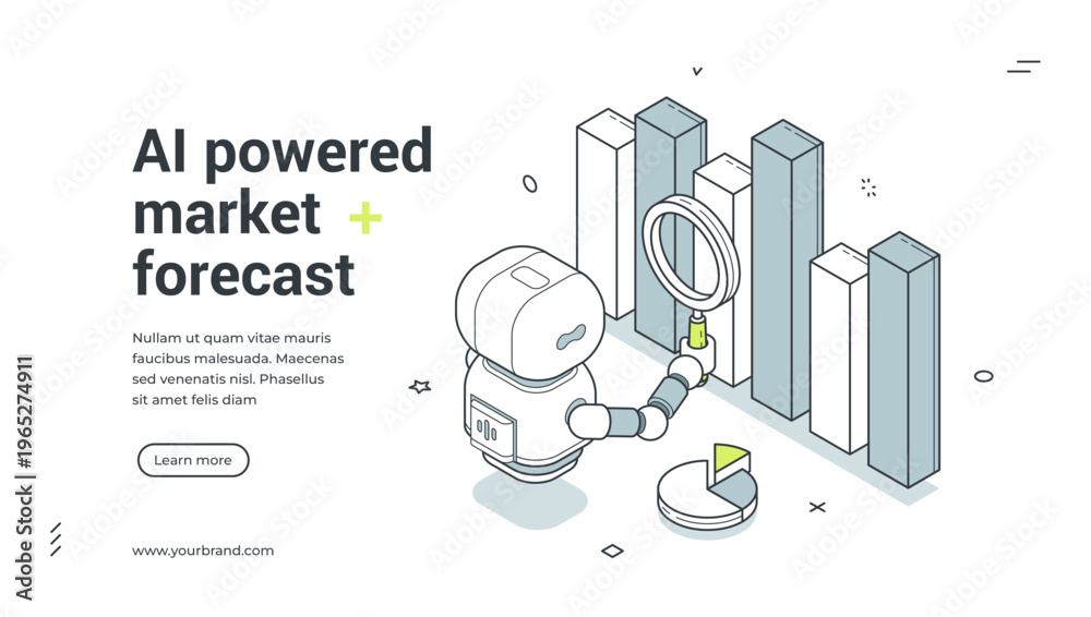 Plakat - AI powered market forecast isometric banner. Vector illustration for a web landing page template. Business analytics with robot and chart for financial strategy and data research.