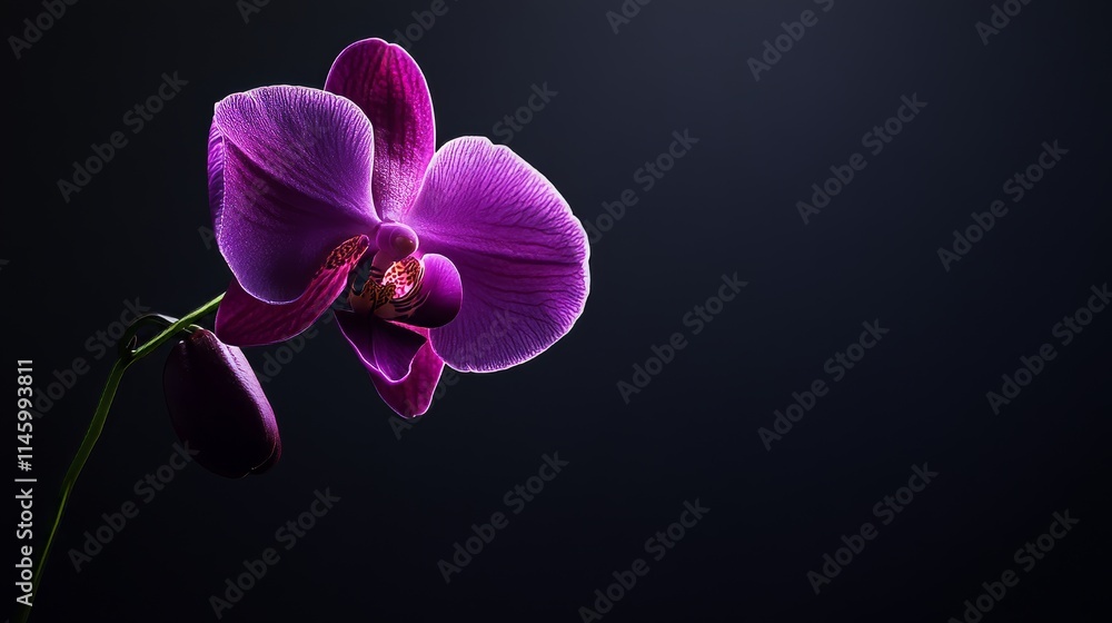 Plakat - A single purple orchid against a dark background, low-key lighting shot, Dramatic style.