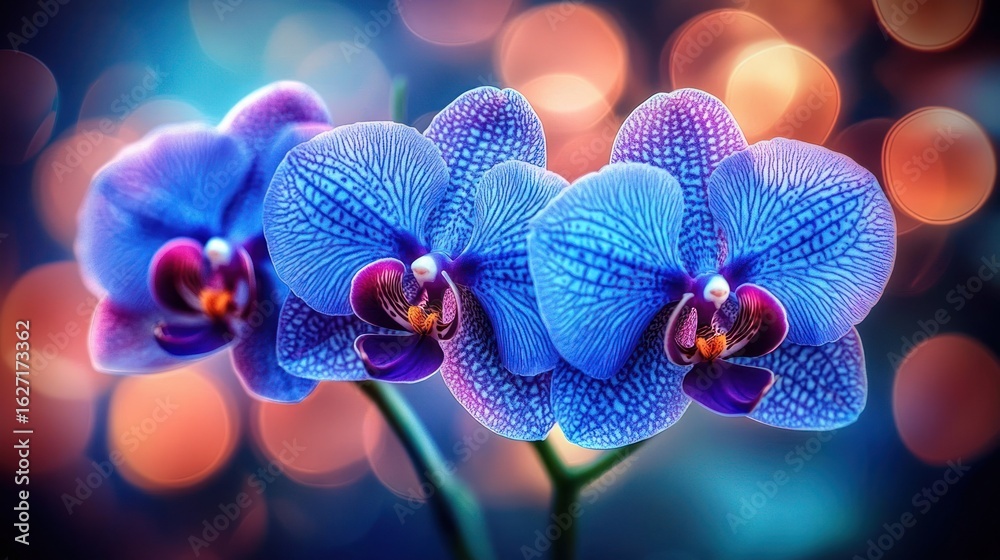 Plakat - Close-up of vibrant blue and purple orchids with intricate patterns and delicate petals against a bokeh background of warm orange and pink lights, evoking beauty and tranquility.