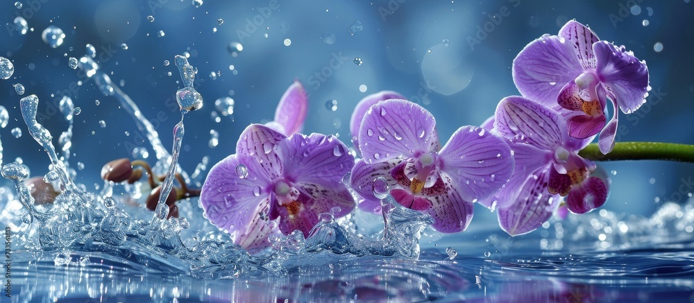 Plakat - Mauve orchids bloom in blue water with close-up splashes of waves and drops..