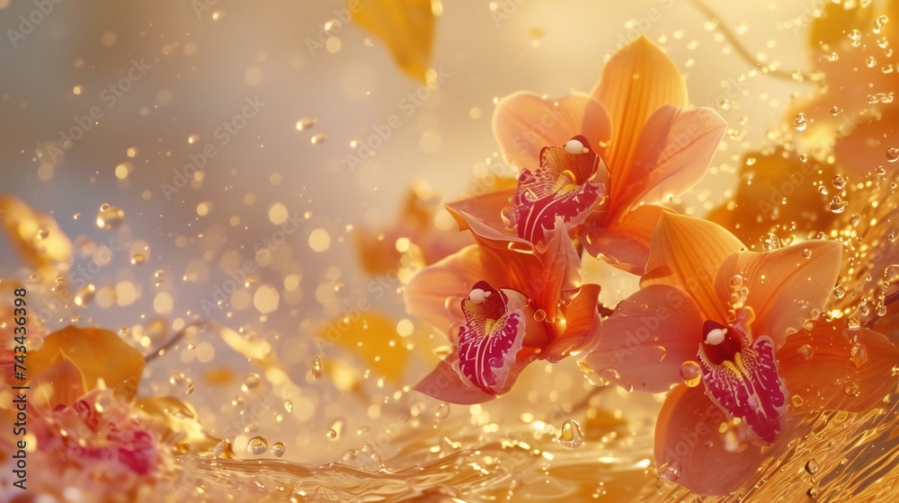 Plakat - Orchid Cascade: Macro shot captures autumn orchids showered by golden leaves, calming waves..