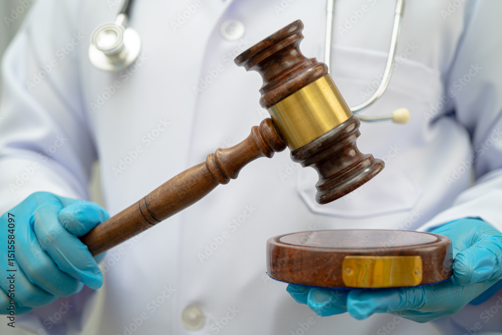 Plakat - Doctor holding judge gavel, forensic medicine, medical law and crime justice concept..