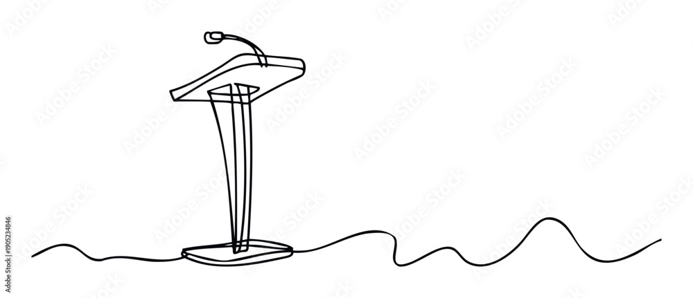 Plakat - A continuous one line drawing of a speakers podium with an integrated microphone, suitable for illustrating public speaking events, conferences, educational content, and communication.