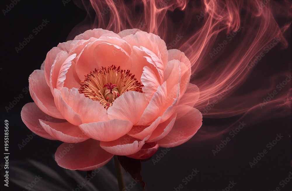 Plakat - Soft pink peony blooms with ethereal red smoke swirling around.