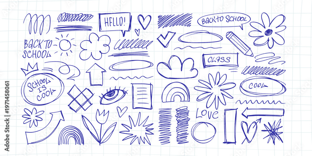 >Plakaty>Wybrane motywy - zobacz więcej !>Paryż>Big isolated blue pen scribbles set. Hand drawn school doodles, eye, rainbow, pencil and abstract shapes on grid. Vector rough chaotic sketch elements collection for modern pop art collage design.
