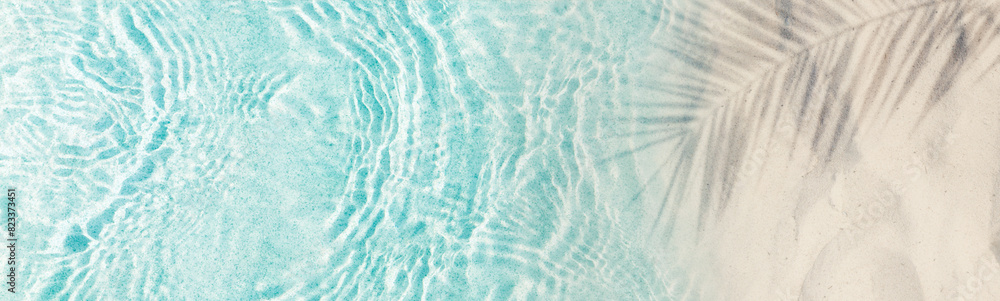 >Plakaty>Wybrane motywy - zobacz więcej !>Piasek>abstract empty sand beach from above with palm leaf shadow over transparent turquoise water wave, sunny background concept banner with copy space for travel and summer vacation outdoors