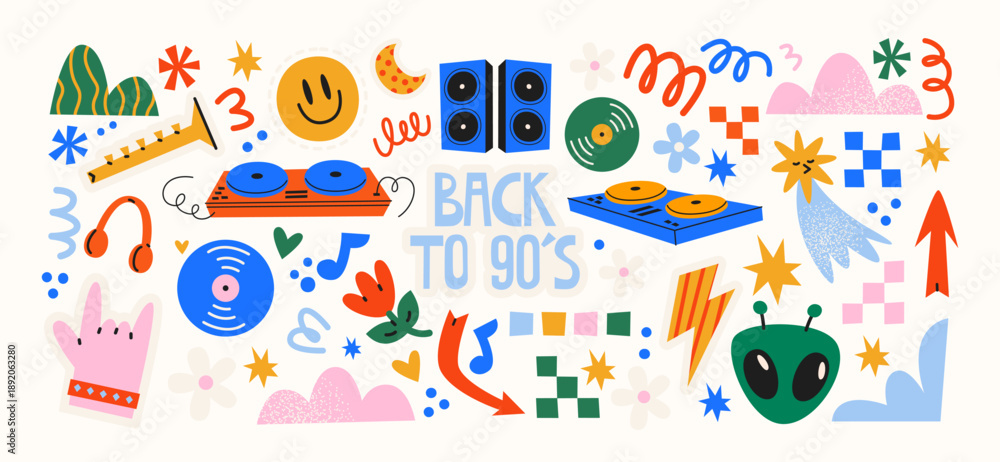 Plakat - Retro disco party stickers in 90s style. Music elements: vinyl records, DJ turntables, speakers, headphones, smiley icons, abstract shapes. Nostalgic dance party concept inspired by nineties culture.