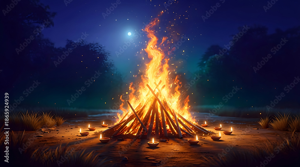 Plakat - Traditional bonfire with oil lamps and full moon night scenery for lohri festival spiritual background, traditional indian winter festival at night with glowing warm fire light.