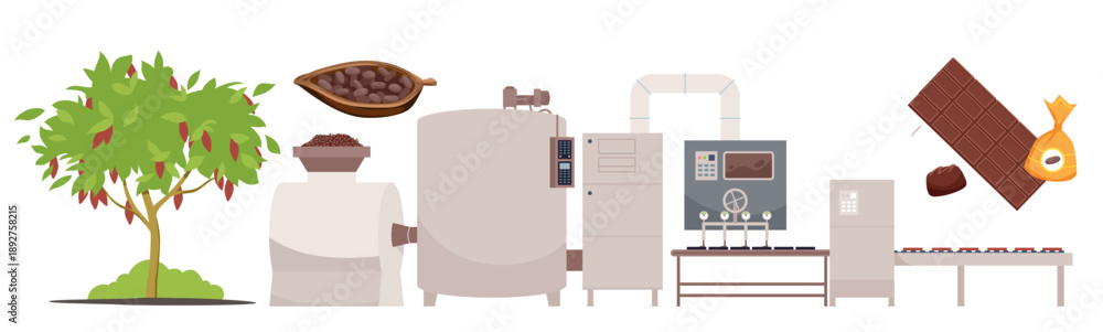 Plakat - Cocoa tree, beans, industrial chocolate making machines, and finished chocolate products shown in a step-by-step manufacturing process isolated on white background vector illustration.