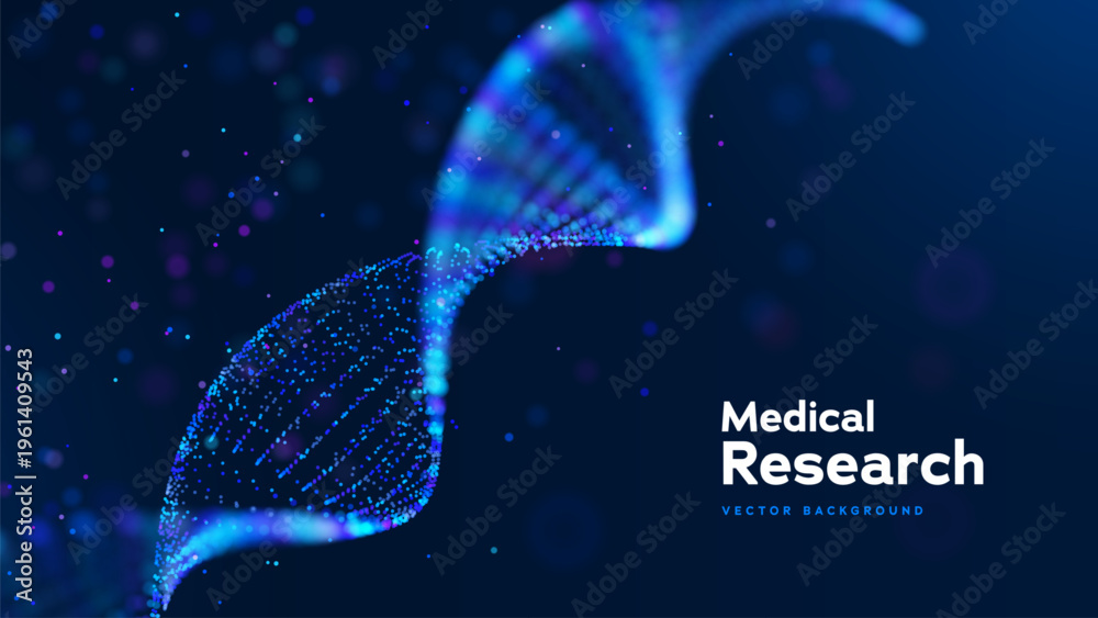 Plakat - Medical Research Abstract Background With DNA Helix Made Of Glowing Particles And Data Flow. Biotechnology And Science Innovation Concept. Medical Researches And Genetic Analysis. Vector Illustration..