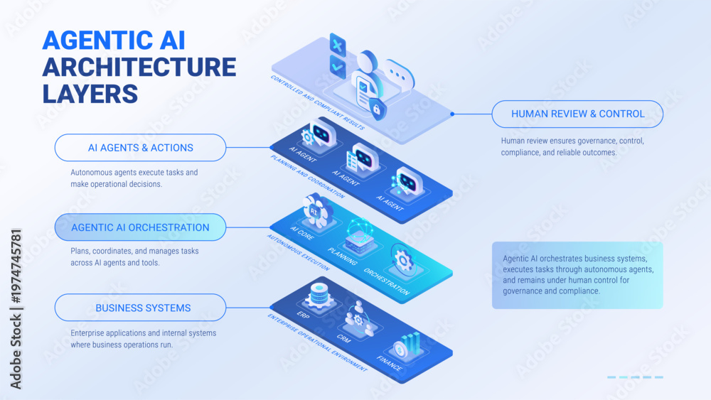 Plakat - Agentic AI Architecture layered diagram template - isometric infographics technology vector - Agentic AI orchestrates business systems, executes tasks via autonomous AI Agents under human control.