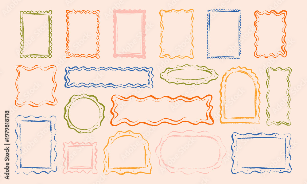Plakat - Crayon doodle scalloped edge frame set. Cute kid text box. Hand drawn squiggle wavy rectangle, oval, square, circle, arch shape boarder. Zigzag curvy crayon childish borders, picture, photo frames.